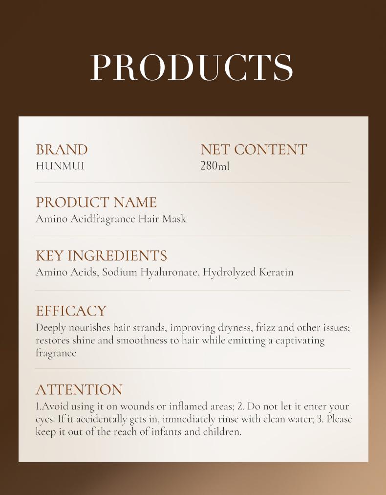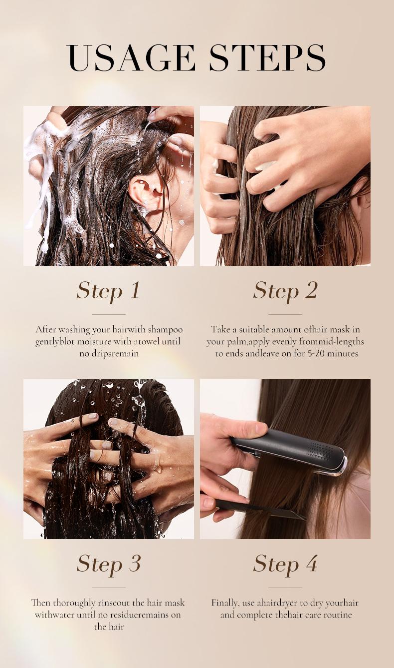 Usage: After washing your hair with shampoo, use a towel to absorb all the moisture from your hair until it stops dripping. Take an appropriate amount of hair mask in the palm of your hand and evenly apply it from the middle to the ends of your hair. Let the hair mask stay on your hair for 5 to 20 minutes, then thoroughly rinse off the hair mask with water to ensure there is no residue. Finally, blow-dry your hair!
